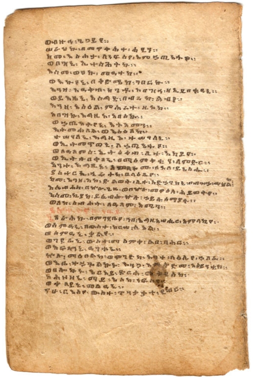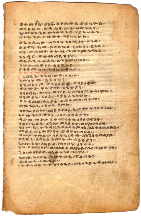 Ge'ez lingua è una delle lingue semitiche parlate in Etiopia nel passato, e probabilmente originata da 2 fonti: La lingua di Saba è nata nel sud dello Yemen alcuni secoli a.C., e rappresenta una vecchia lingua araba semitica parlata dalla famosa regina di Saba biblica. Inoltre è conosciuta come lingua Himyarite. E la seconda fonte era dall'Egitto durante la sentenza Hyksos. Gli Hyksos erano tribù semitiche; invasero l’Egitto e fu governato per 400 anni. Quando furono espulsi dall'Egitto sono fuggiti in Nuba, Etiopia, e Canaan. Il regno cristiano di Aksum (Etiopia vecchio) aveva occupato lo Yemen nei primi secoli d.C.. La lingua ge'ez è una combinazione dei due, il semitico e le vecchie lingue etiopi. Era sparito con il tempo e oggi è utilizzato solo nelle scuole ortodosse biblici e cristiani nella vecchia Etiopia. Quello che vedete qui è scritto in copto antico un testo della Bibbia Salmi su foglia su pergamena, vitello o pelle di capra con grassetto inchiostro nero e rosso. L'inchiostro rosso è solitamente riservato per il nome di Dio o di Santi. Alcuni scritti sono scomparsi con gli anni. L'effetto di umidità è evidente in questo manoscritto, ma il testo non ne ha risentito. Misura 4.5 "x 6.9". Va fatta una verifica questa lingua, quindi non sono sicuro circa la data esatta o il contenuto, ma secondo alcuni esperti e riferimenti, queste bibbie non sono datate e variano da 300 a 600 anni di età.